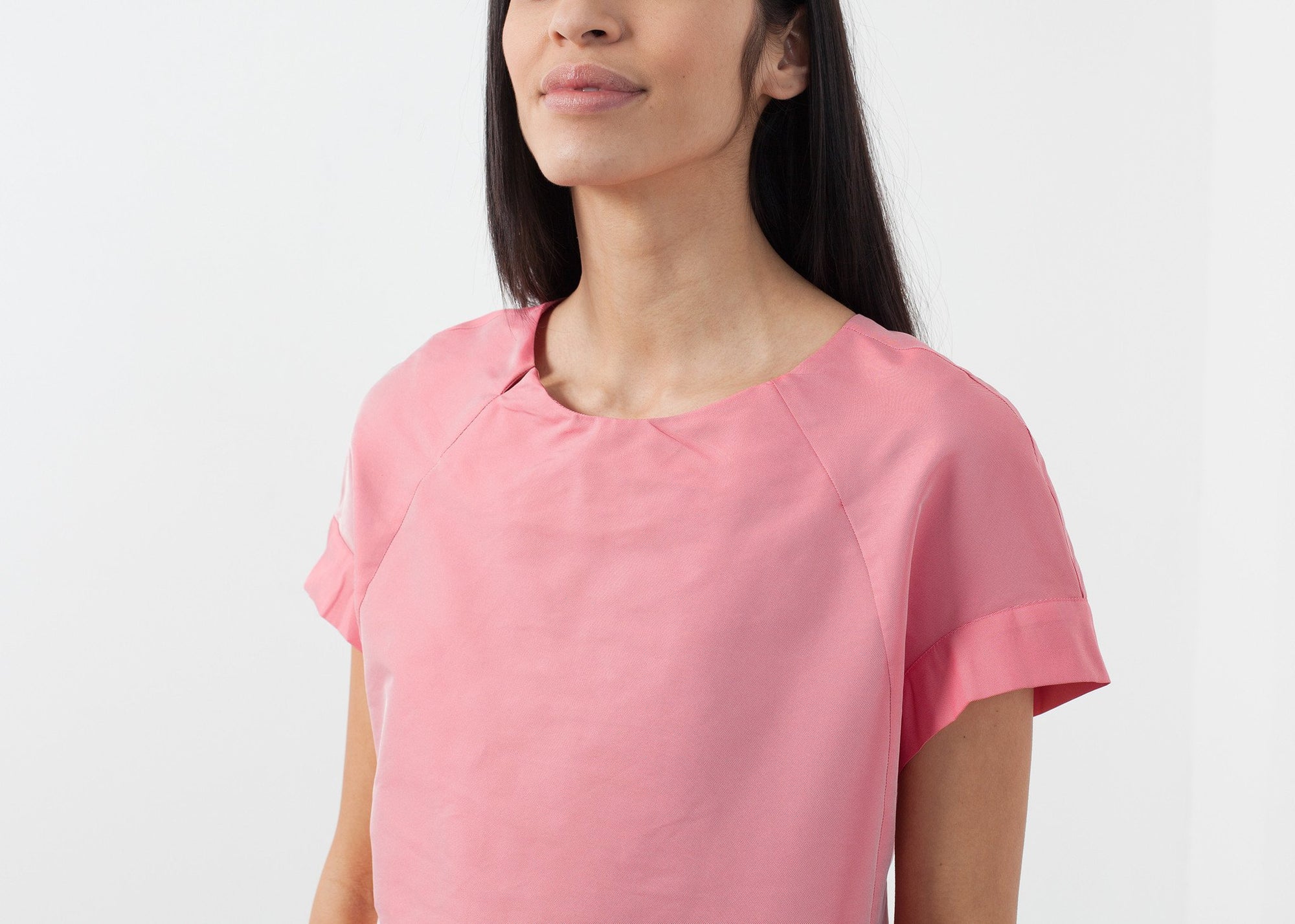 The Retenue Dress offers a wide neckline and a slightly oversized silhouette. Raglan seaming. Drawstring at back waist. Side angled pockets at front. Lilith. Color Pink. 100% Polyester. Ashley is wearing an X-Small.